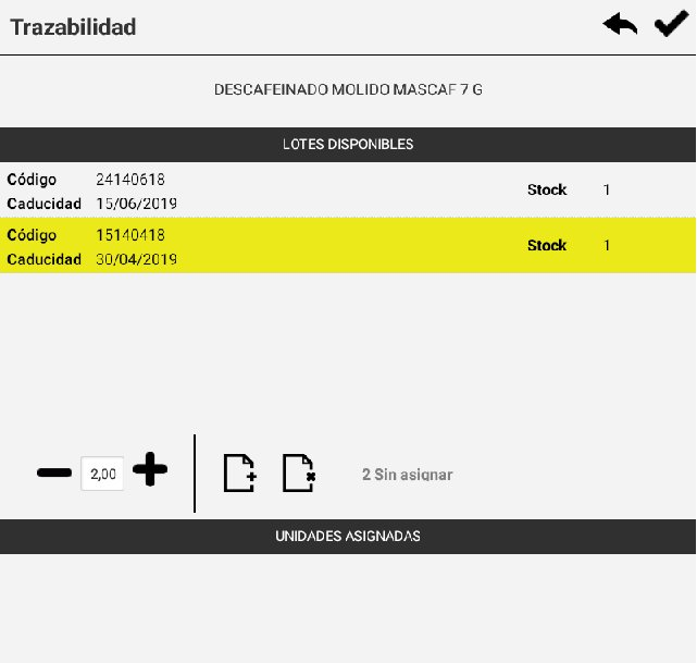 En este tipo de Trazabilidad, se mostrará una lista con los Lotes disponibles de los cuales dispone el Artículo. Una vez seleccionado el Lote deseado, simplemente añadiremos las Unidades deseadas a ese Lote, hasta que queden todas las unidades vendidas Asignadas.